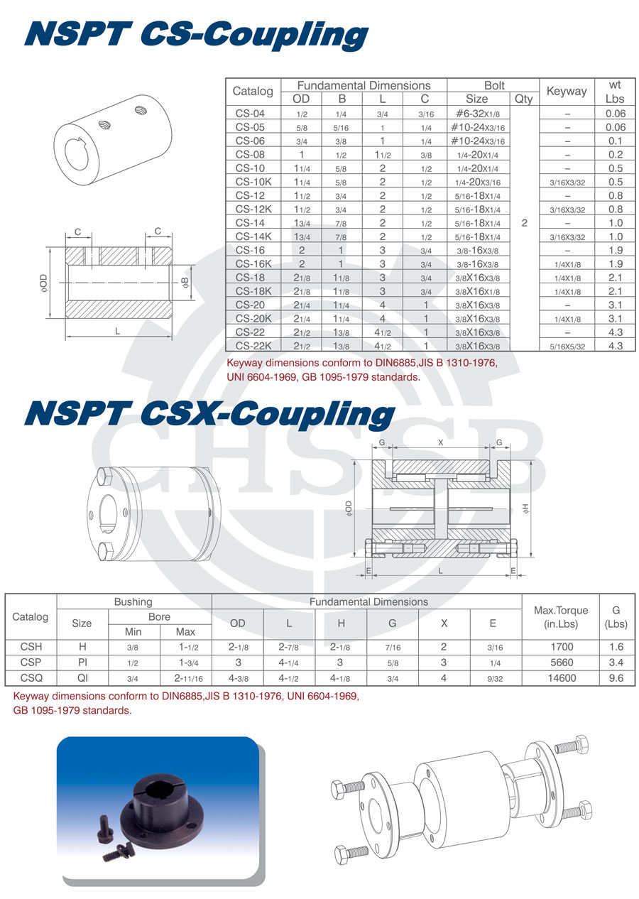 產品范圍: 美標/歐標:(CSH/CSP/CSQ) 英制尺寸產品(適用于美標市場) 公制尺寸產品(適用于歐標市場) CSX型聯軸器 CSH型聯軸器 CSP型聯軸器 CSQ型聯軸器
